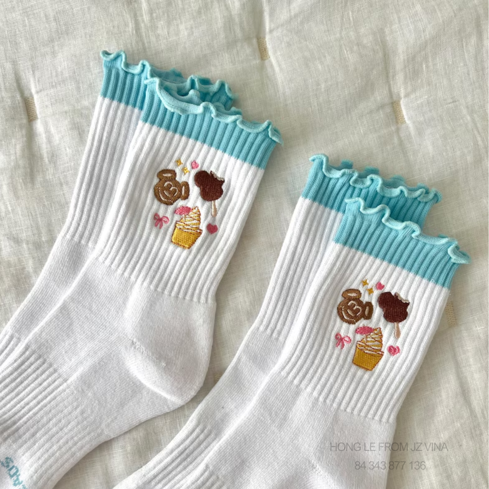 Wholesale BSCI Crew Pilates Socks with Cute Fruit, Bear & Cupcake Embroidery Custom Logo Anti-Slip Ruffle for Gym Yoga Barre