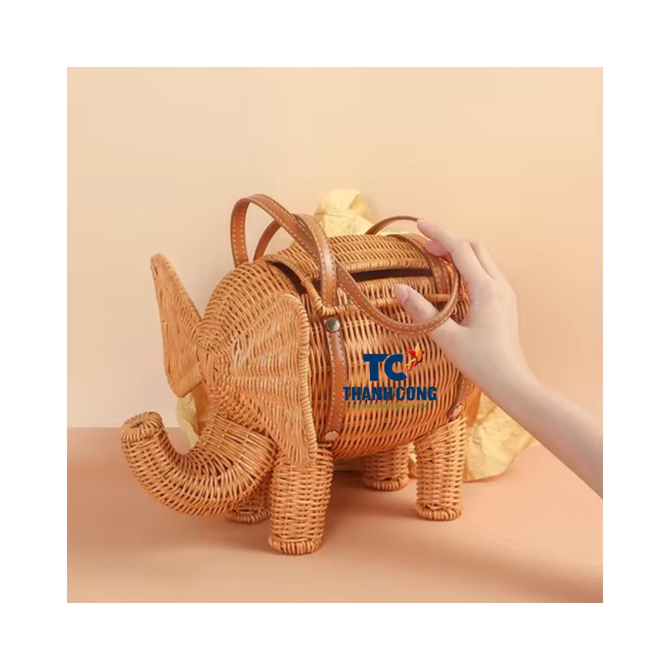 Wholesale Baby Elephant Shaped Rattan Basket With Leather Handle Can Be Worn Cross-Body As Decoration