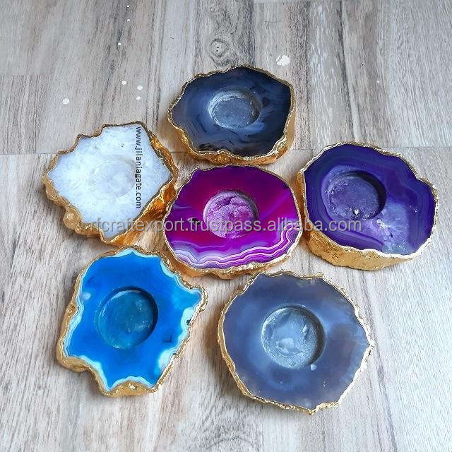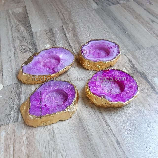Wholesale Best Quality Home Decor Natural Purple Orgone Pink Agate Crystal Candle Holder Carved Gold Trim Tea Light Gemstone