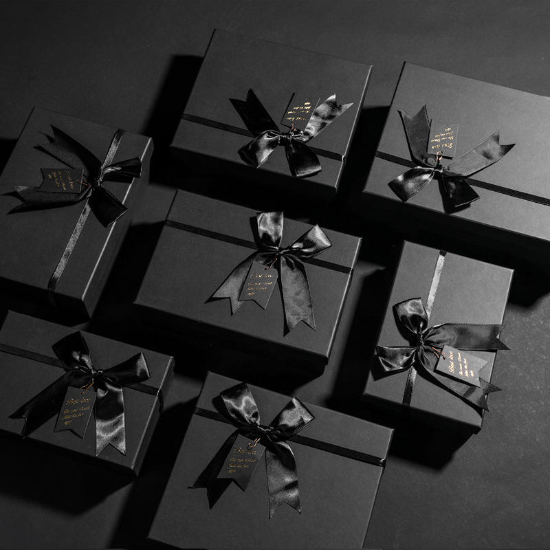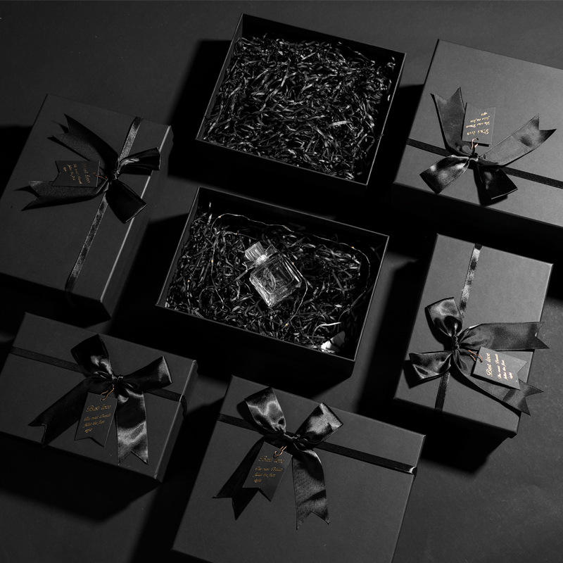Wholesale Black Cardboard Paper Gift Packaging Box With Bow Ribbon Raffia Card Custom Packaging Paper Bag Paper Boxes for Gifts