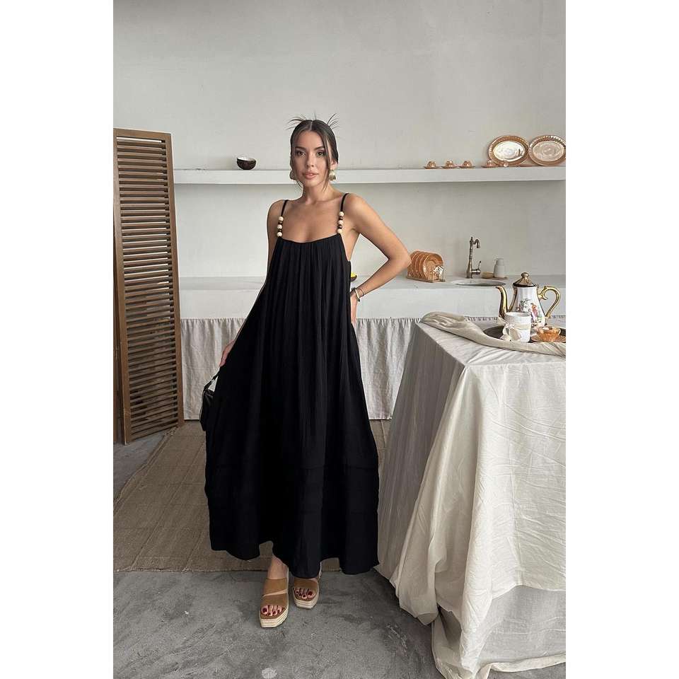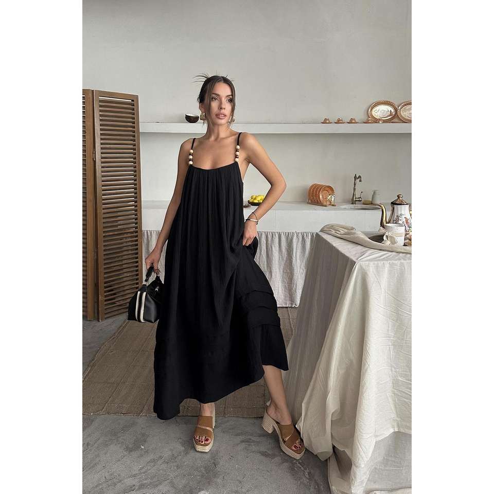 Wholesale Black Crocheted Strappy Muslin Dress for Women Solid Pattern Knee-Length Office Lady Style One for Spring/Autumn Day