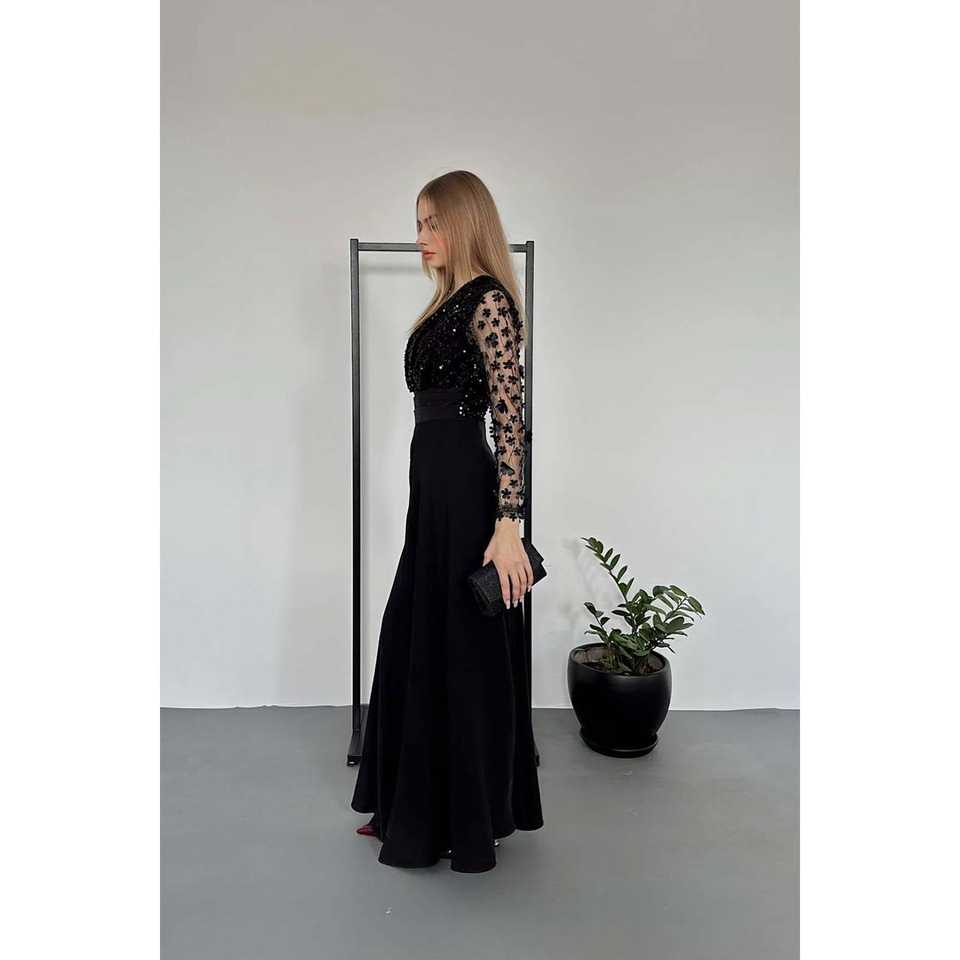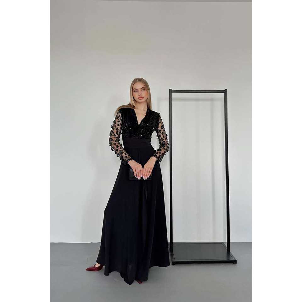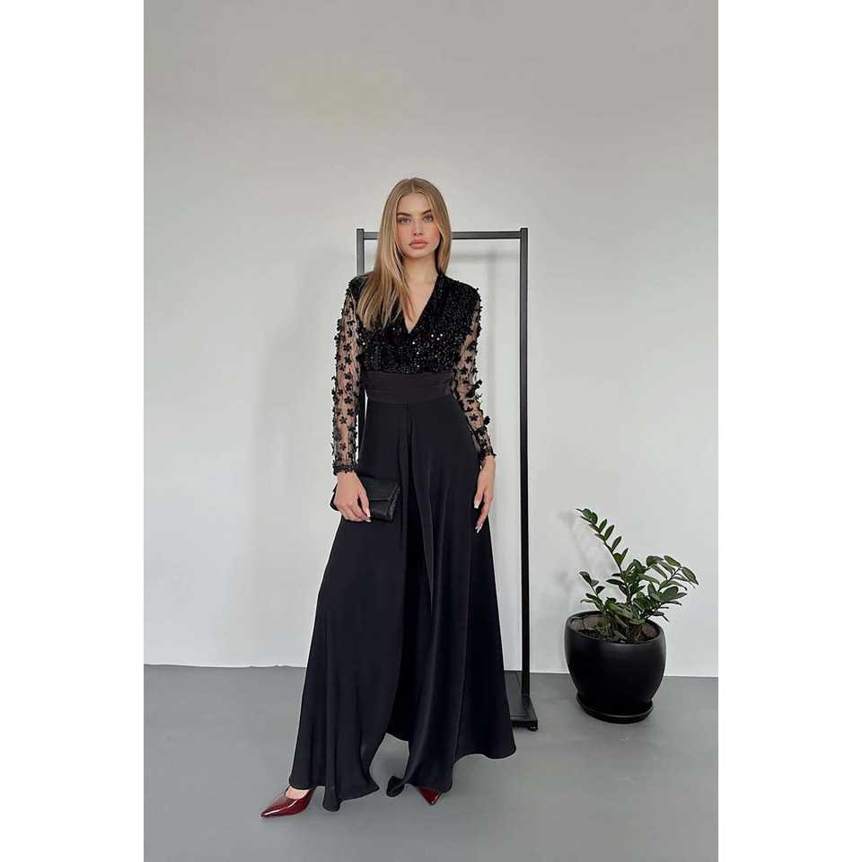 Wholesale Black Jumpsuit with Sheer Tulle Sleeves and Skirt