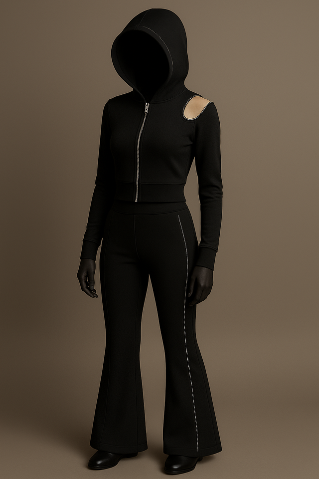 Wholesale Black Women's Athleisure Tracksuit Set Hooded Zip Hoodie Short Cut-Out Shoulder Flared Pants Breathable Two-Piece