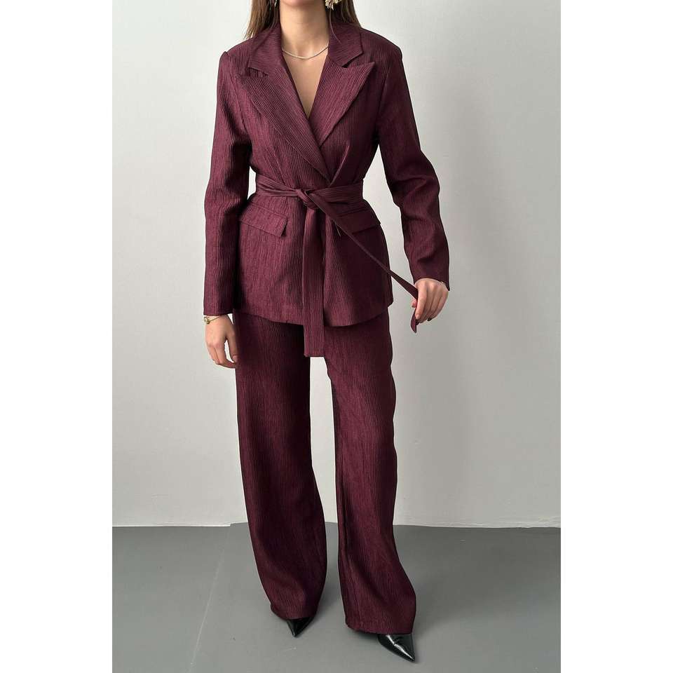 Wholesale Burgundy Belted Formal Jacket and Trousers Set Shiny Design