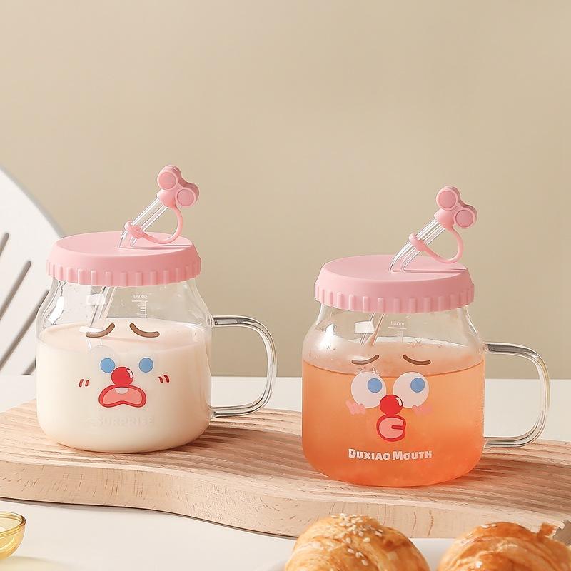 Wholesale Cartoon Borosilicate Glass Bottle Coffee Mug Clear Water Bottle With Straw and Handle