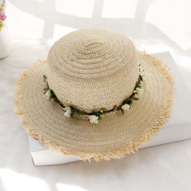 Wholesale Casual Straw Hat for Women Sun protection Outdoor Garland Flat Top Hat Travel Seaside Beach Folding Sun Hat