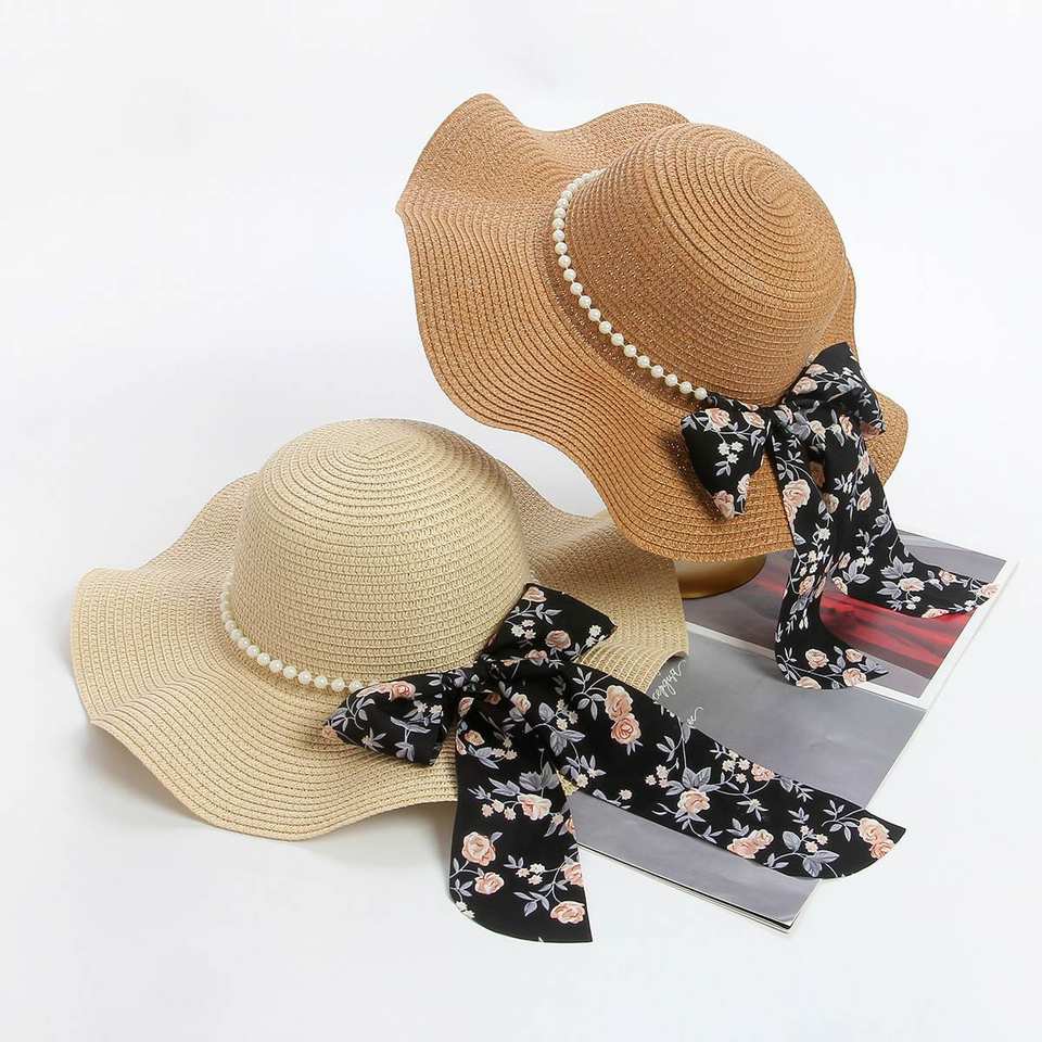 Wholesale Casual Straw Hat for Women Sun protection Outdoor Travel Seaside Beach Pearl Bow Sun Hat