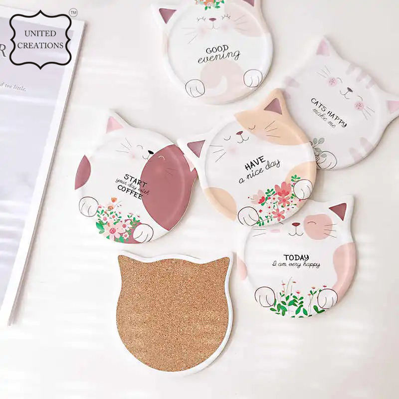 Wholesale Cat Shape Ceramic Coaster for Drinks Customized Printed Cork Cup Mats & pads Coasters