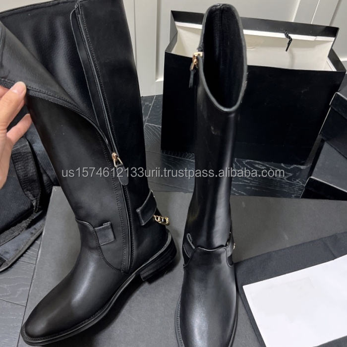 Wholesale Channel New Style Women's Luxury Design Black Elegant Cowhide Zip Knee-High Boots Shoes for Ladies
