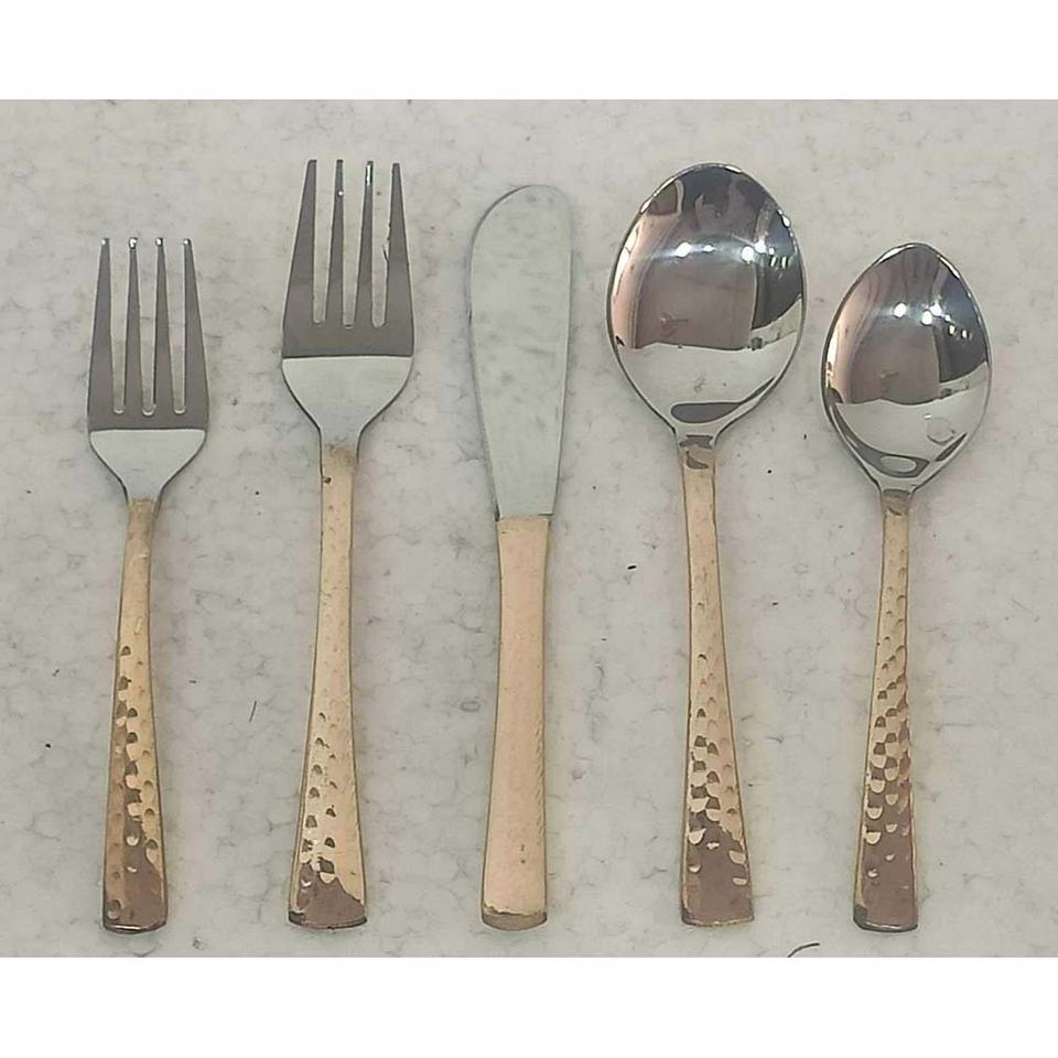 Wholesale Cheap Price Stainless Steel Gold Polished Designer Hammered Long Flat Handle Spoon Knife & Fork Cutlery Set