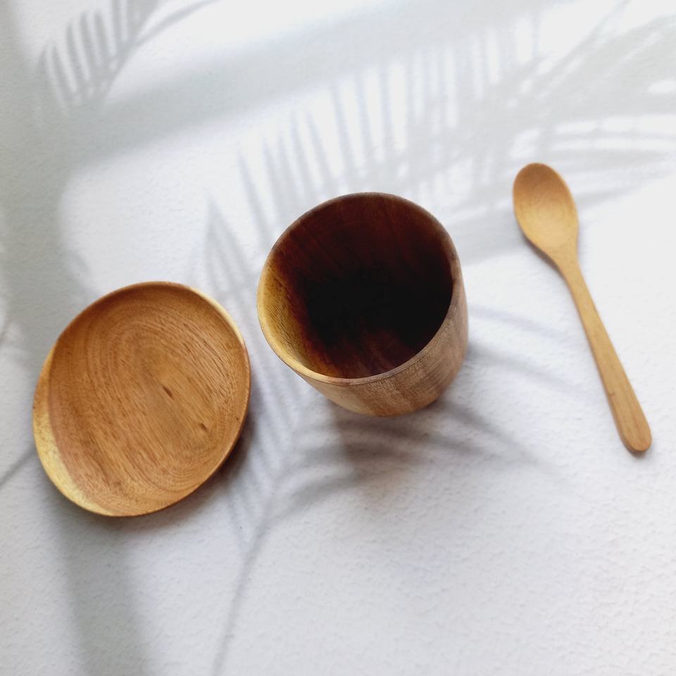 Wholesale Cheap Tableware Wooden Wood Water Milk Cup Sets Acacia Mug With Wood Mat Coaster Spoon Made In Vietnam