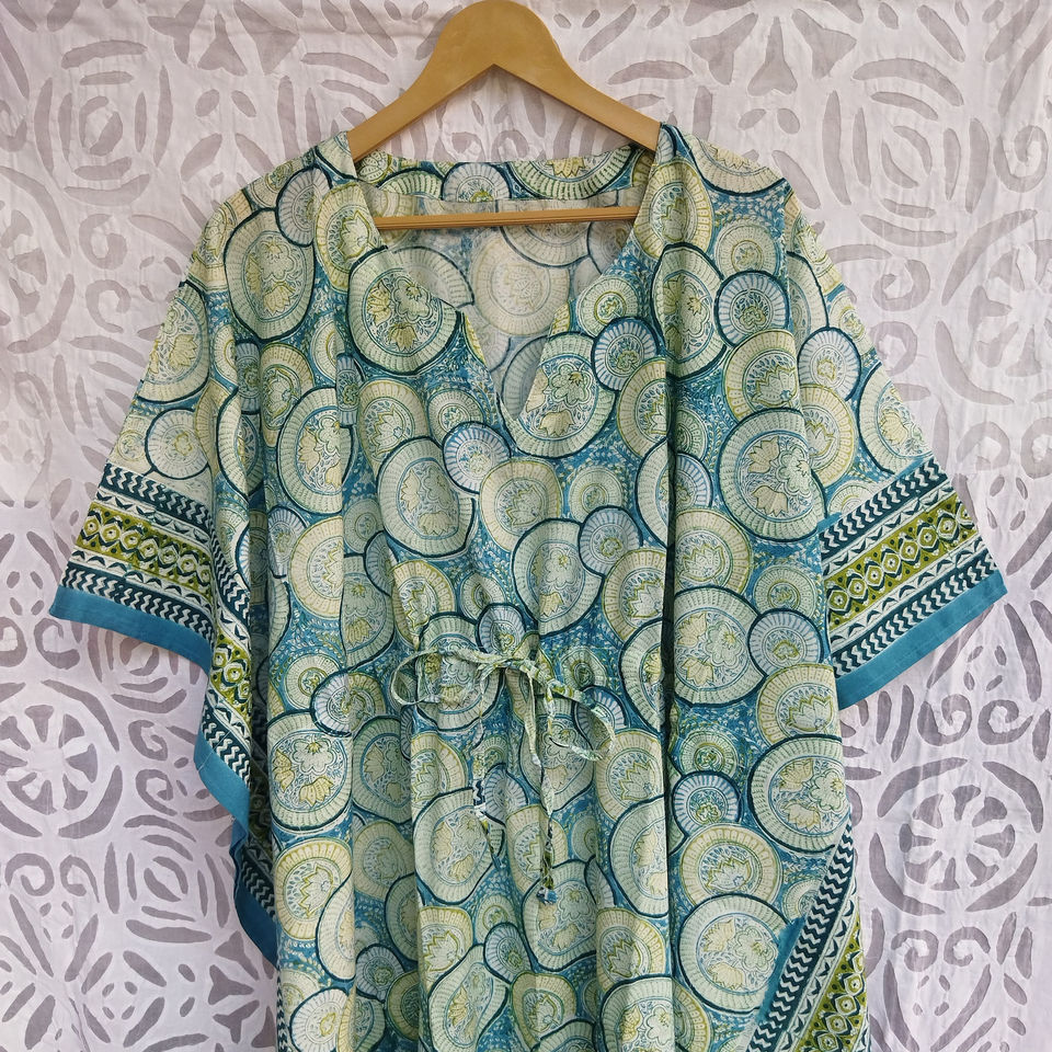 High Quality Cotton Block Printing Fabric Kaftan With Drawstring Tie Waist Looses Fitting Caftan Beach Vacation Women Clothing