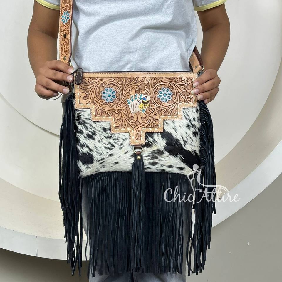 Product name:Hand Tooled Cowhide Leather Fringe Shoulder Bag
