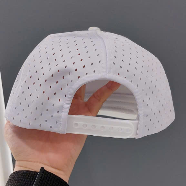 Wholesale Custom 6 Panel Flat Brim Hat High Quality Rubber Patch Logo White Polyester Gorras Laser Cut Hole Rope Baseball Hat