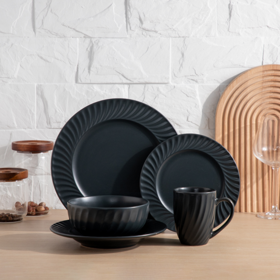 Wholesale Custom Black Ribbed Ceramic Tableware, Matte Stoneware Dinner Set, Free Design & Custom Logo Available