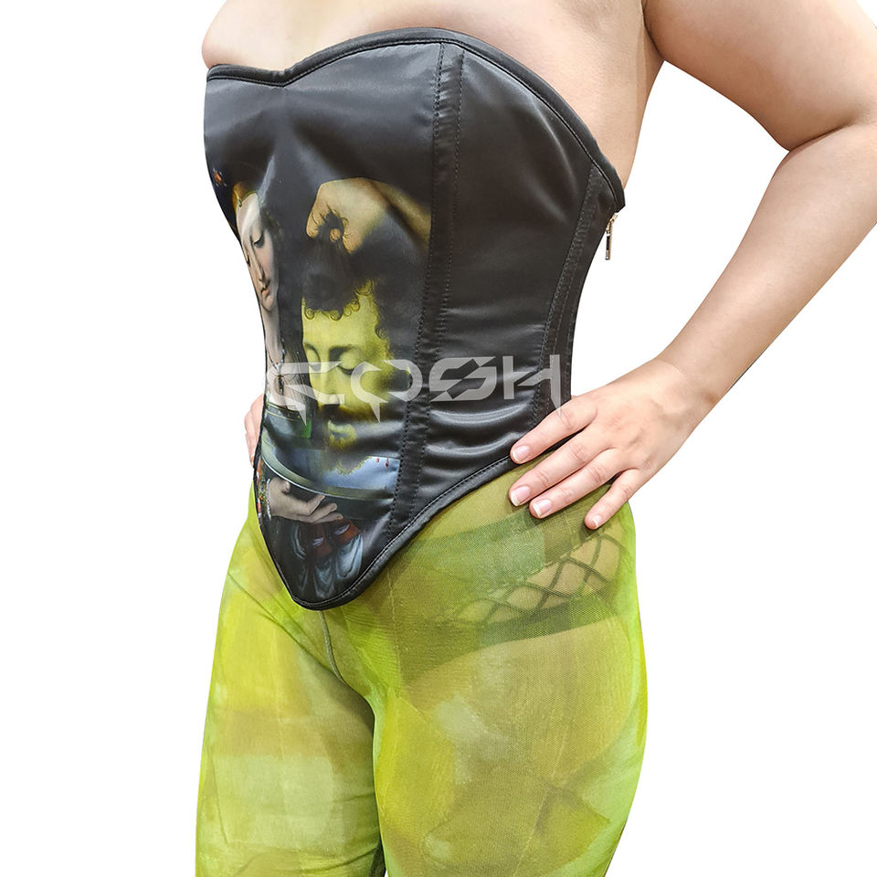 Wholesale Custom Black Satin Printed Corset With Judith and Holofernes Print Design & Printed Green Stretchable Legging