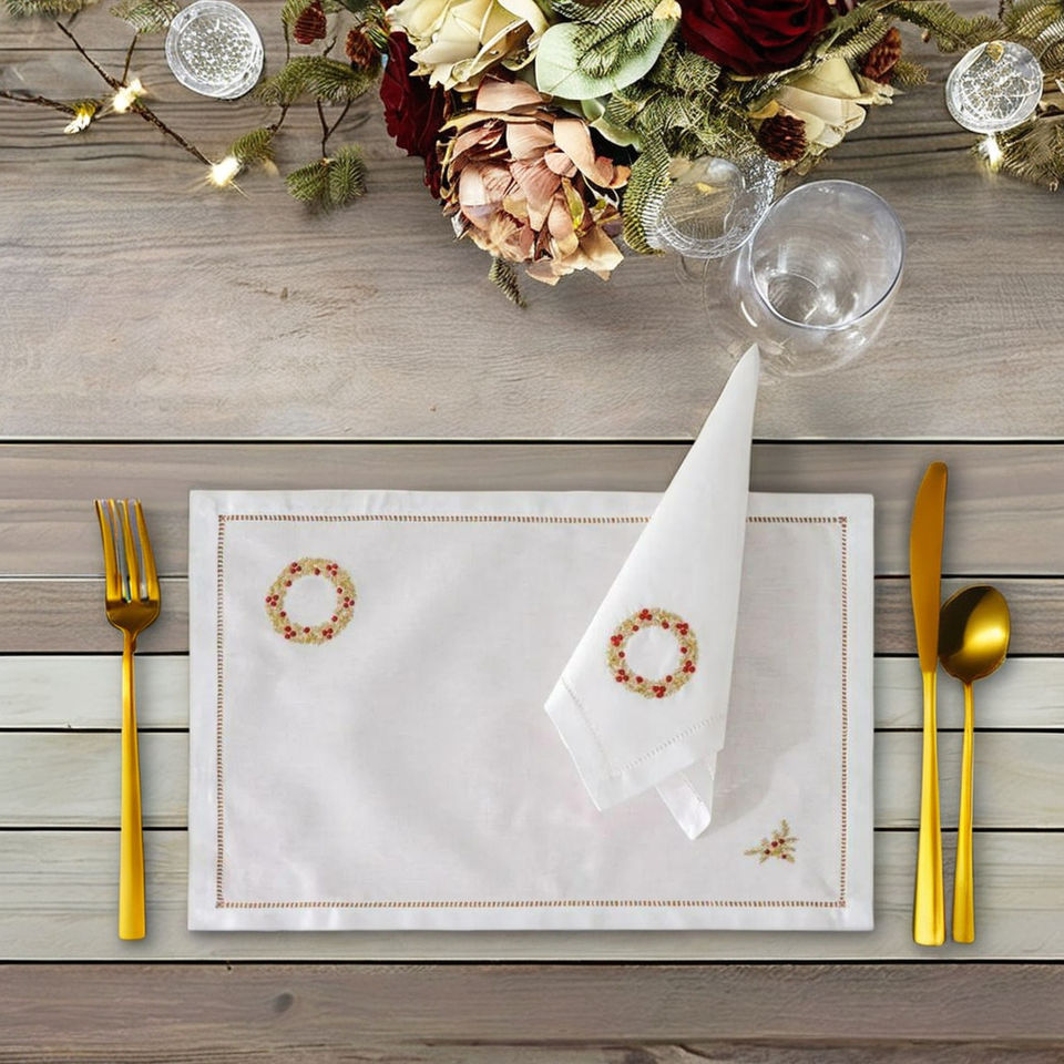 Wholesale Custom Cotton Hemstitch Mat Set Hand Embroidered Gold Wreath Christmas Placemat and Napkin Set Washable Home Holiday