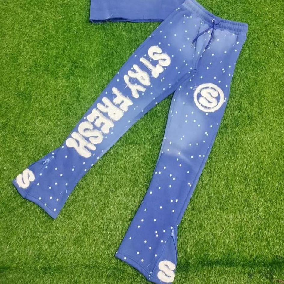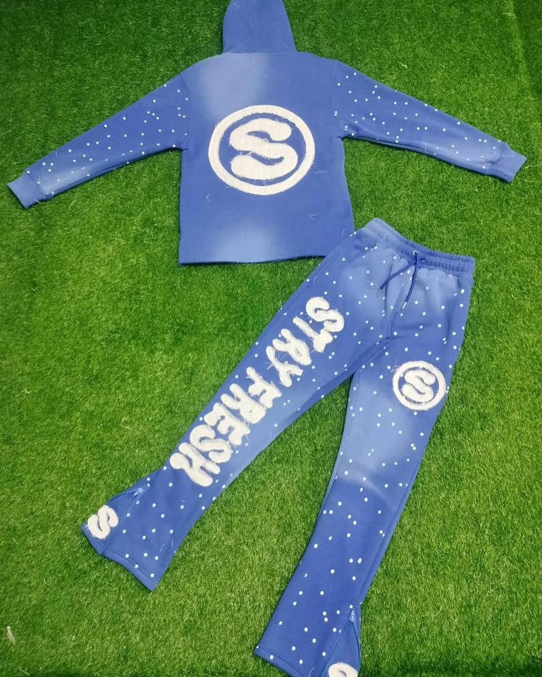 Wholesale Custom Distressed Applique Embroidery Winter Windproof Streetwear Solid Vintage Flared Pants Hoodie 2 Piece Set