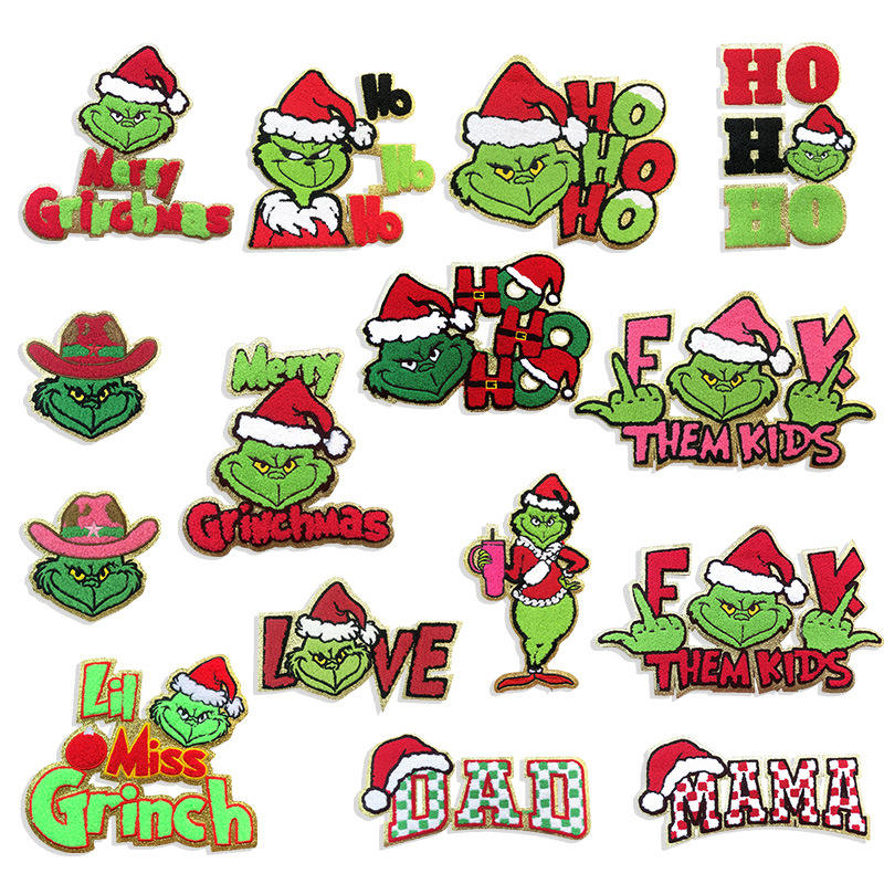 Wholesale Custom Eco-Friendly High Quality Christmas Iron-On Chenille Embroidered Patches with Sequins for Grinch Clothing