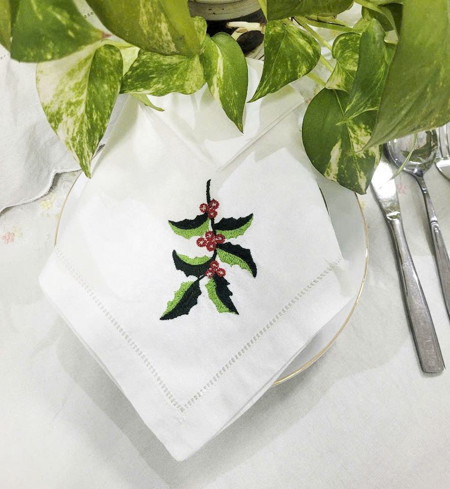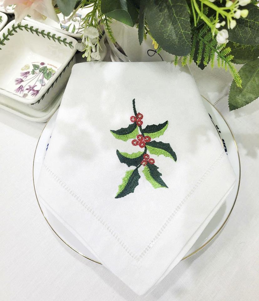 Wholesale Custom Embroidered Holly Leaves Christmas Table Dinner Napkins Cotton Hemstitch Cloth Napkins Home Hotel Holidays