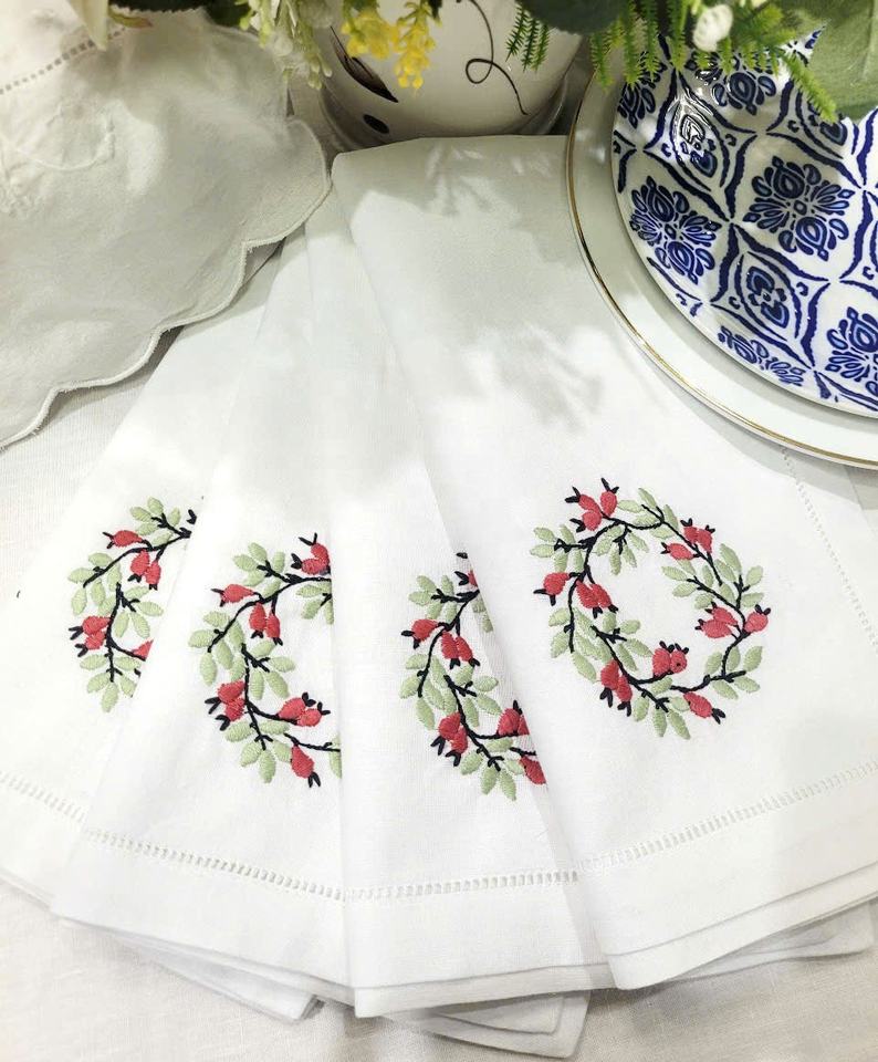 Wholesale Custom Embroidered Wreath Christmas Table Dinner Napkin Cotton Hemstitch Cloth Napkin Home Hotel Holidays