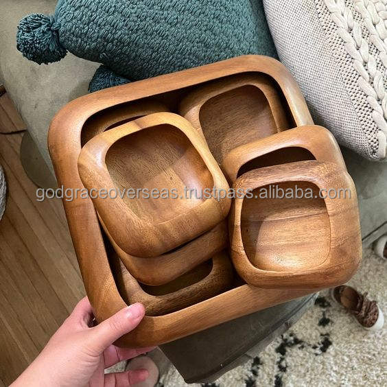 8 Inches Acacia Wood Salad Bowl Set with 1 Set Spoon and Fork in a Gift Box Made From One Pc Solid Acacia Wood Made in India