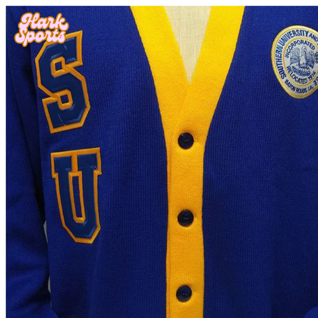 Wholesale Custom Knitted Women's Sorority Fraternity Cardigan V-Neck Striped Covered Button Front Pocket Own Applique Patches