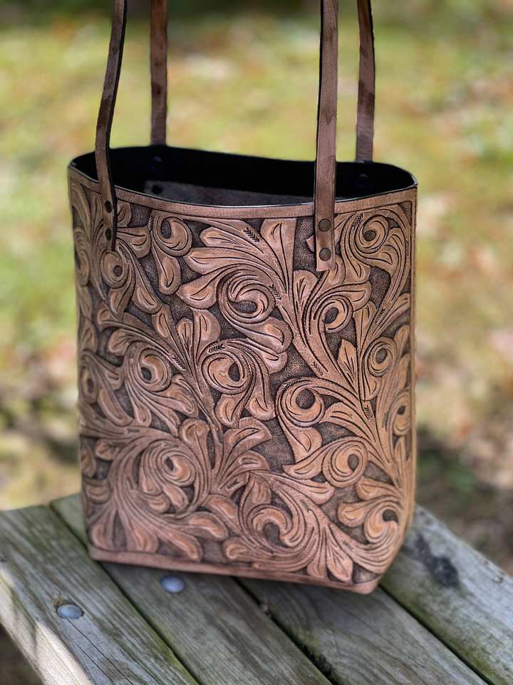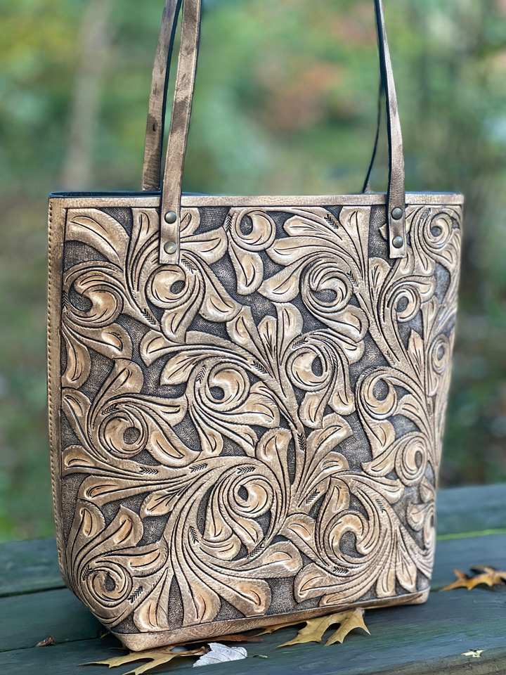 Wholesale Custom Large Capacity Vintage Genuine Leather Material Hand Tooled Floral Carved Tote Bag High Quality New Fashionable