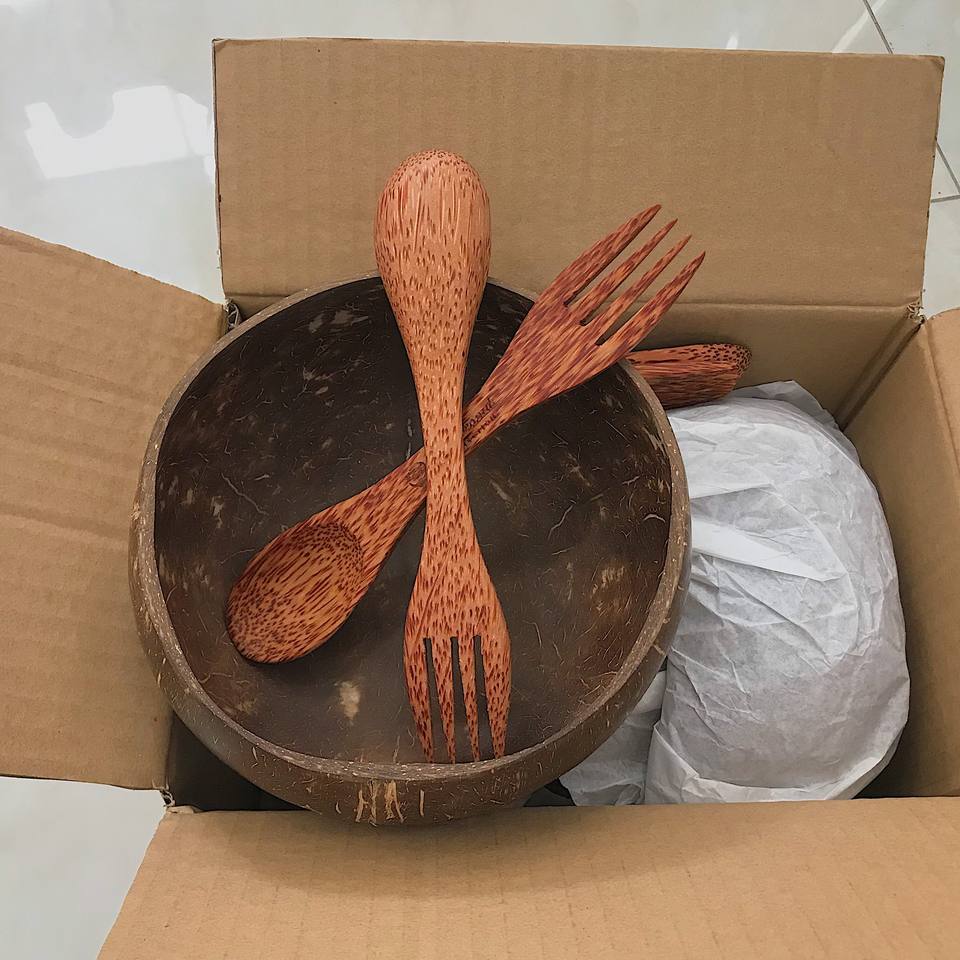 Wholesale Custom Logo Coconut Shell Bowl Set with Wooden Spoon Hand-Polished Real Image Manufacture for Camping