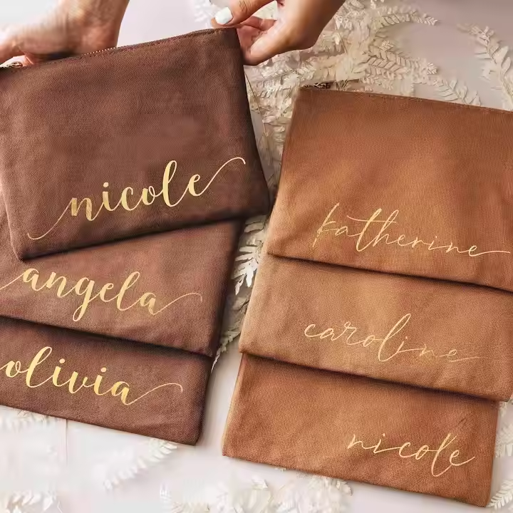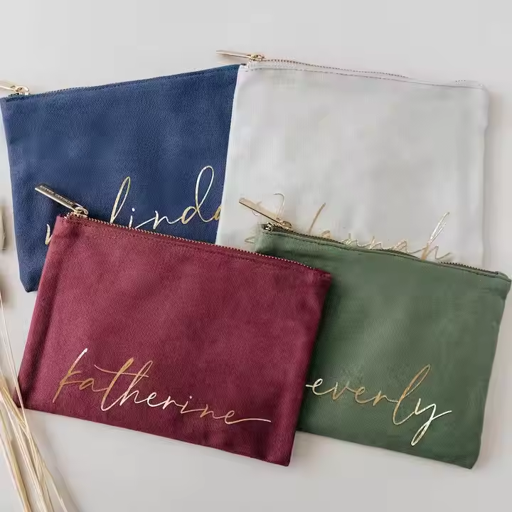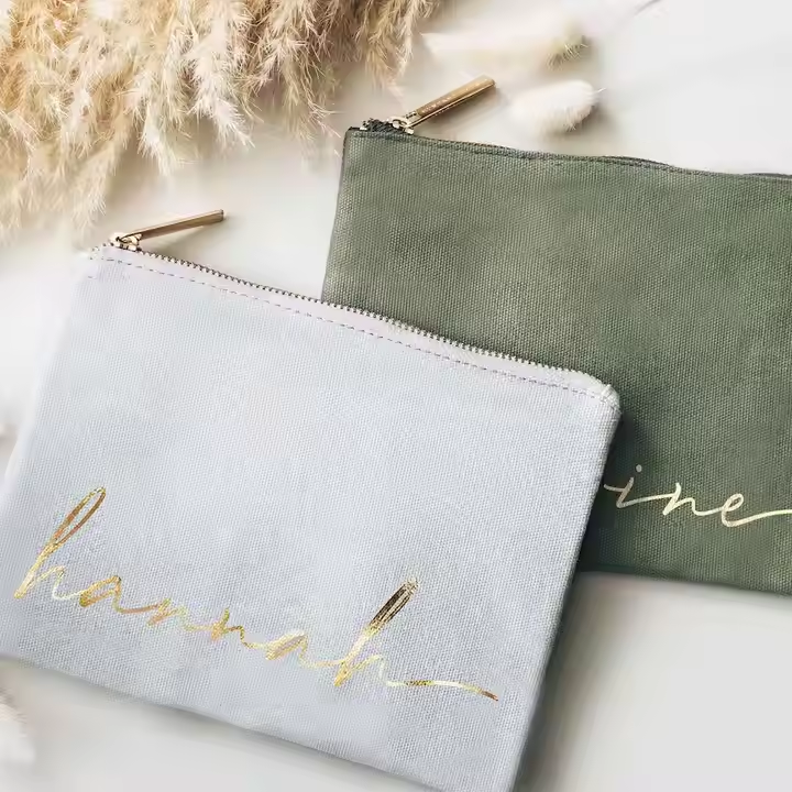 Wholesale Custom Logo Personalized Geometric Fashion Canvas Cotton Zipper Cosmetic Bag Gold Stamping Letter Print Cover Small