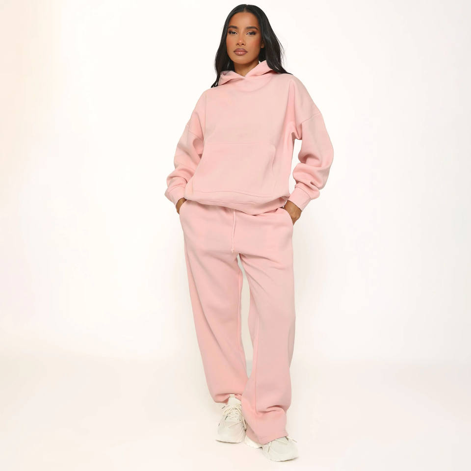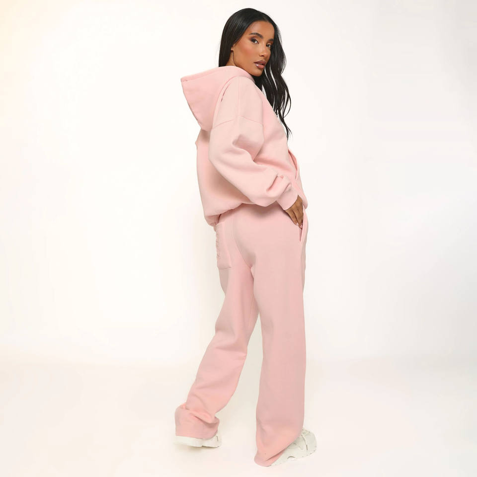Wholesale Custom Logo Pink Women's Tie Waist 2 Piece Tracksuit Set Hoodie & Sweatpants Full Length 2 Piece Women Sweat Suit Set