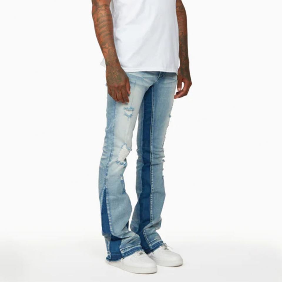 Wholesale Custom Logo Side Stripe Ripped Blue Washed Distressed Hem Men Flare Jeans