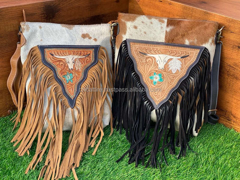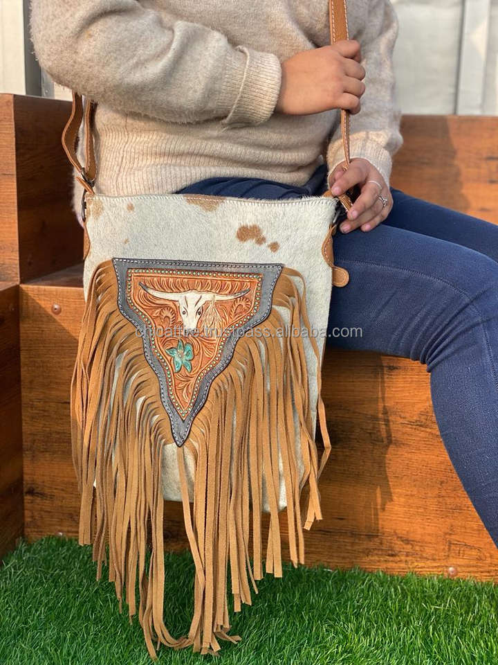 Product name:Hair On Cowhide Tooled Leather Fringe Handbag