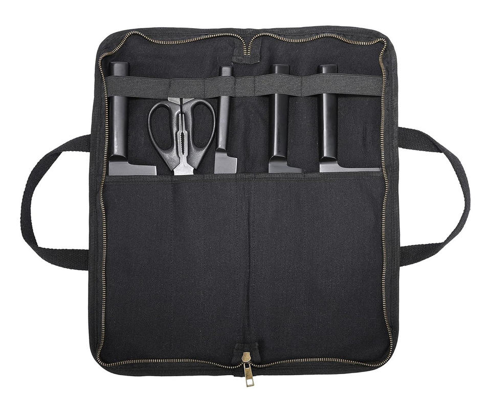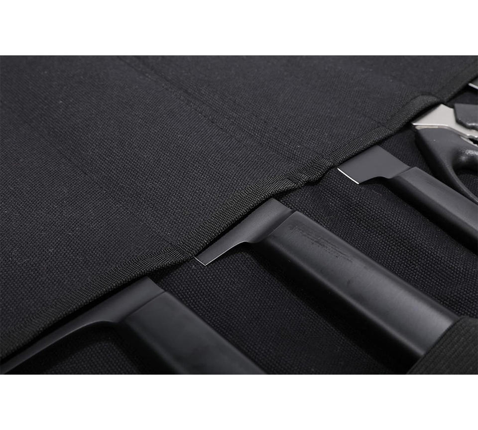 5 knife slots + elastic bands + canvas handle + brass zippernumber of pockets
