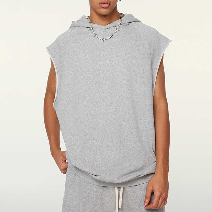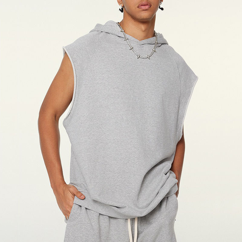 Wholesale Custom Men's Heavyweight French Terry Cotton Vintage Pullover Hoodie Sleeveless with Raw Hem Distressed for Winter