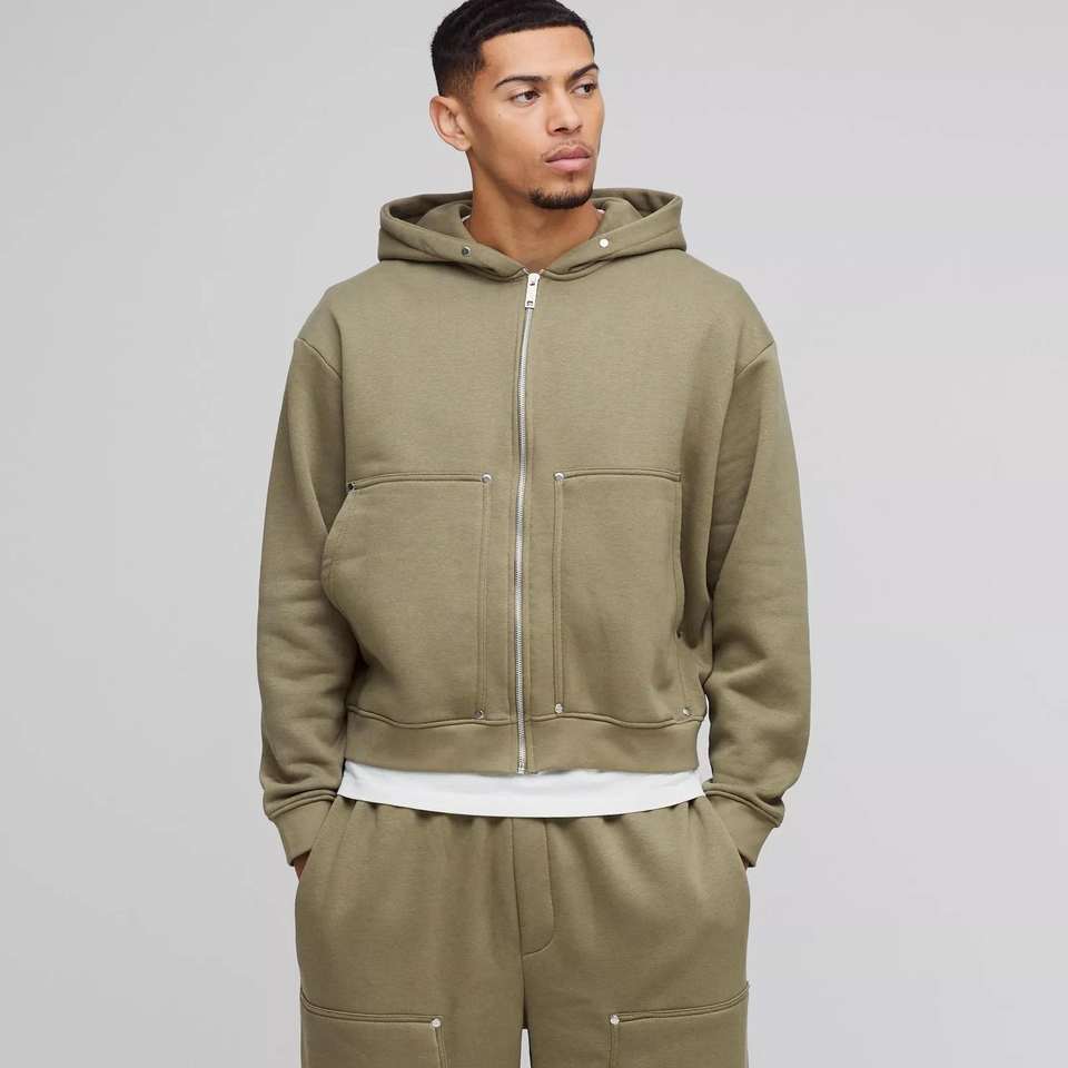 Wholesale Custom Men's Winter Fleece Breathable Oversized Boxy Tracksuit Khaki Carpenter Zip-Up Hoodie Polyester/Cotton 345g
