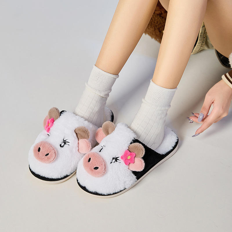 Wholesale Custom Print Cow Flower Plush Home for Slippers Soft Cotton Winter Warm Fuzzy Bottom for Women and Couples