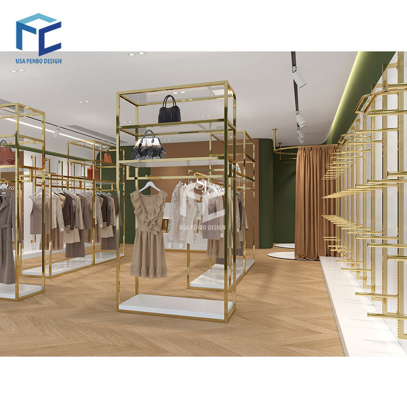 Wholesale Custom Retail Store Clothes Rack Fashion Garments Shop Interior Design Golden Clothing Shop Shelves Design