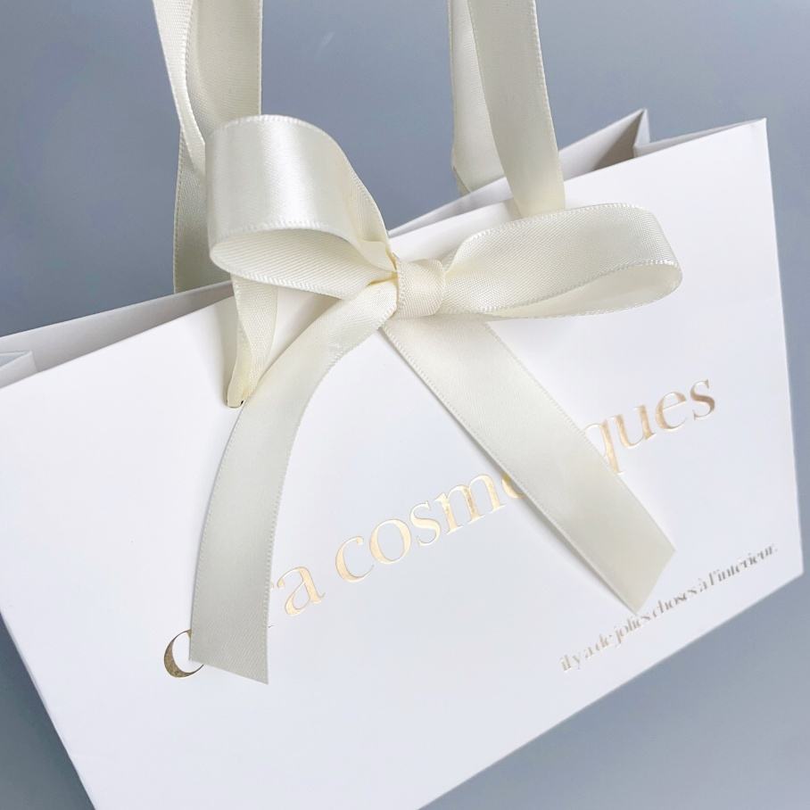 Wholesale Custom Screen Printed White Luxury Shopping Gift Paper Bags with Ribbon Handle and Bow Gold Foil Logo Recyclable