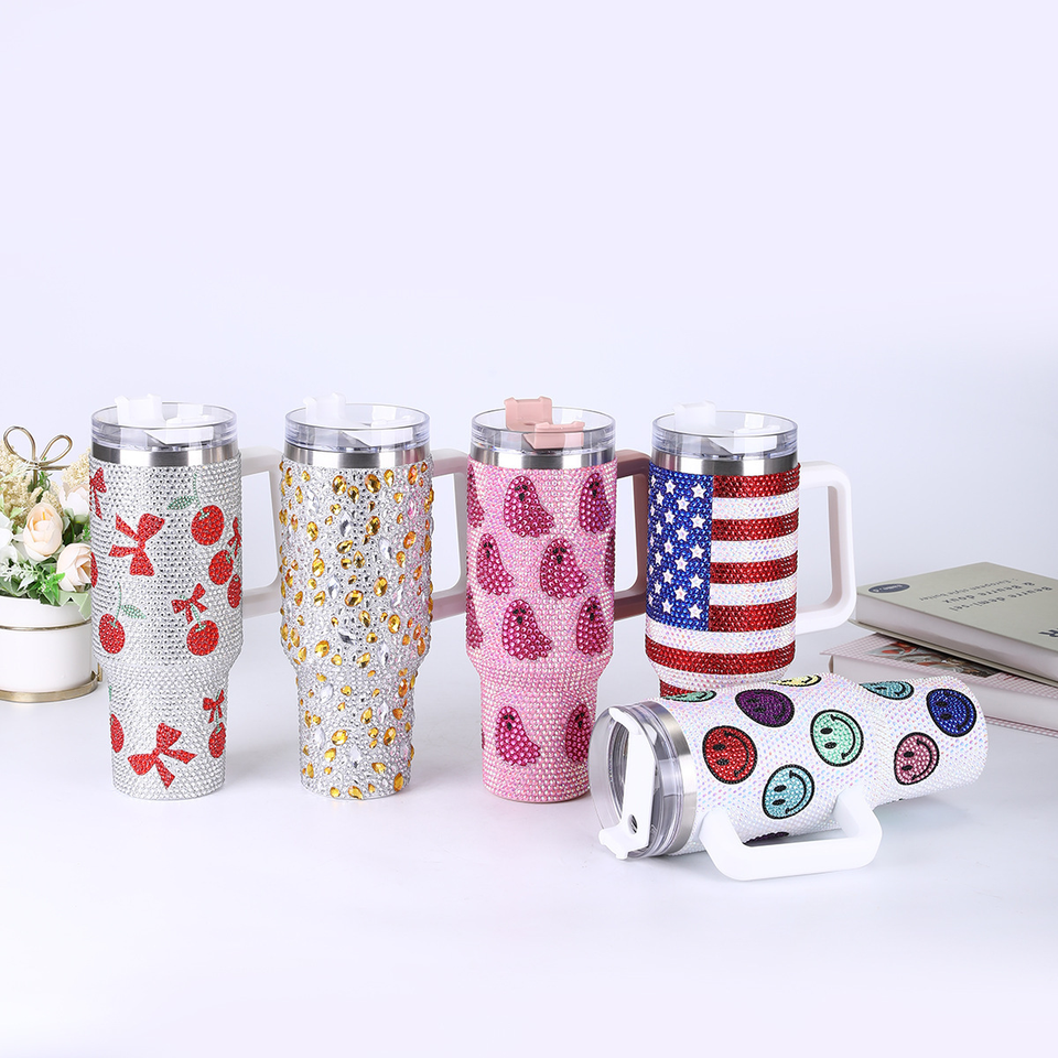Wholesale Custom Vacuum 40oz Tumbler with Handle Leopard Rhinestones Bulk Wholesale Diamond Mug Tumbler Bling Travel Cup