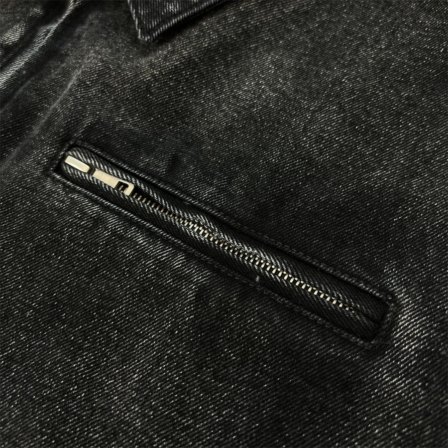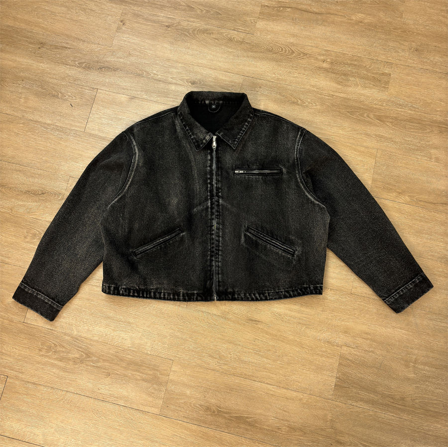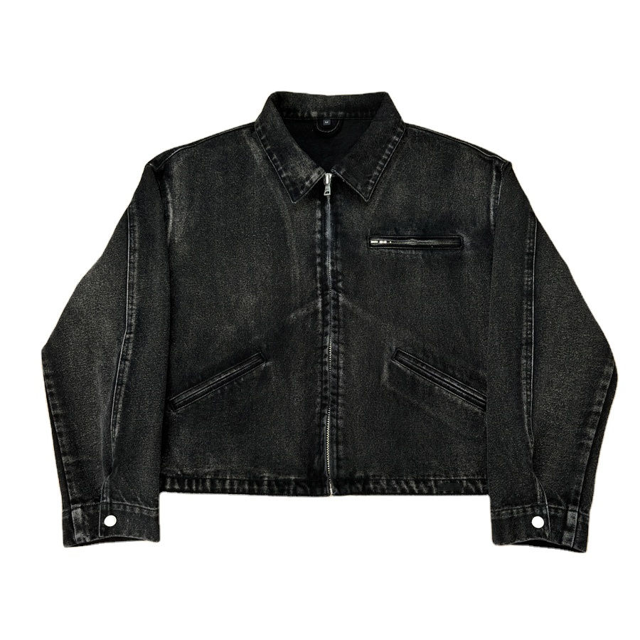 Wholesale Custom Varsity Zip-up Work Jean Jacket for Men 2025 Black Acid Wash Cropped Denim Outwear for Autumn and Winter
