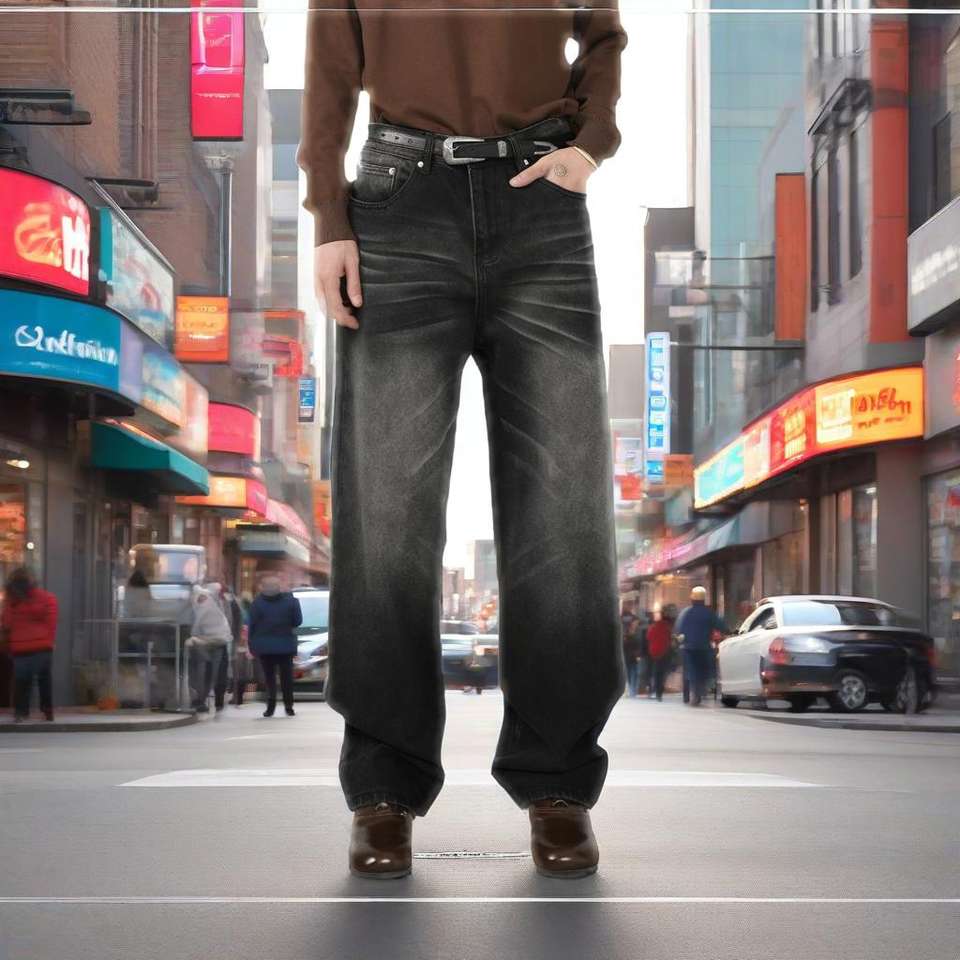 Wholesale Custom Washed Jeans for Men Street Wear Hip Hop Raw Hem Jeans Baggy Sun Faded Loose Straight Dark Blue Wide-leg