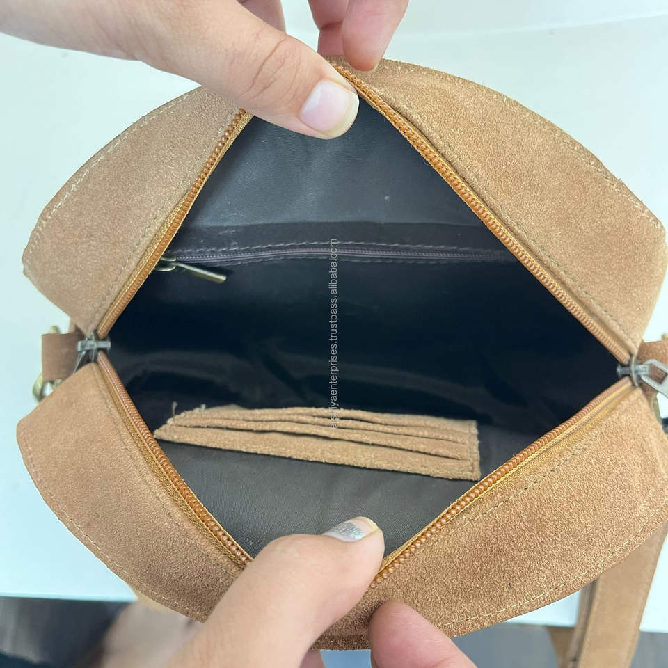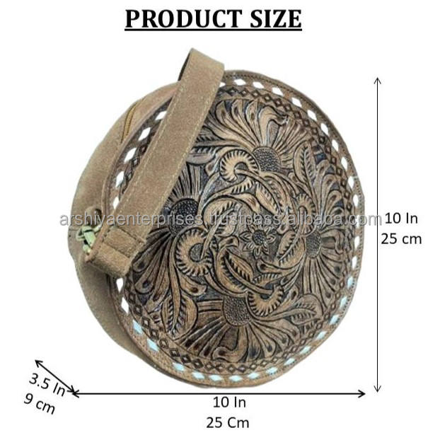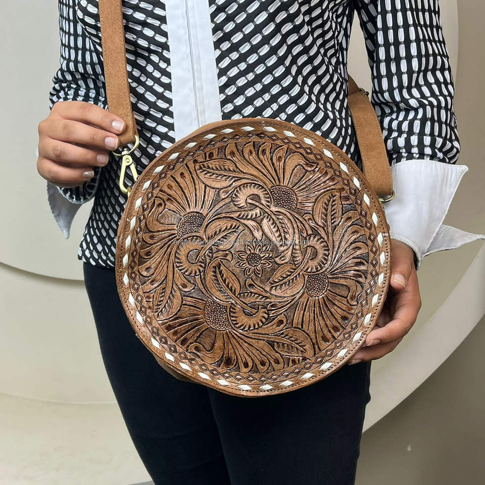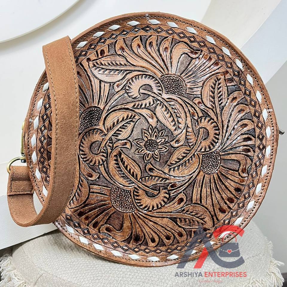 Wholesale Custom Women's Round Floral Handbags Fashion Hand Tooled Cowhide Leather Crossbody Shoulder Bags with Zipper Closure