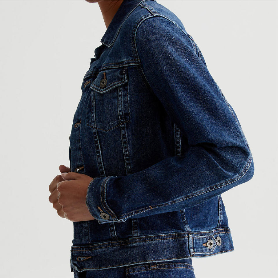 Wholesale Custom Women's Vintage Dark Wash Slim Jean Jacket Stretch Denim Cotton Chest Pockets Adjustable Tabs Button Decoration
