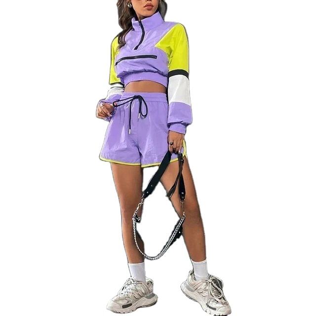 Wholesale Custom Womens Windbreaker Tracksuit Set Half Zip Pullover Crop Top Shorts Short Color Blocks Windbreaker Crop Top 2026