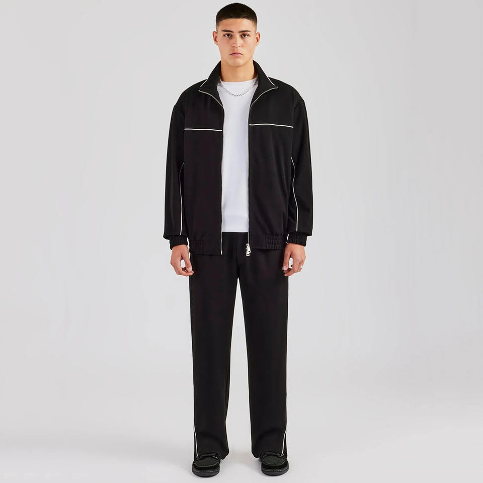 Wholesale Custom logo Mens Oversized Streetwear Black Piping Zip Through Jacket & Trouser Set Blank Sweatsuits Joggers Tracksuit