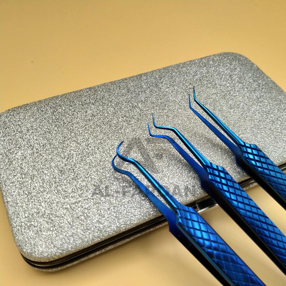 Wholesale Customizable 45 Degree Strong Hook Plasma Blue Solid Volume Stainless Steel Eyelash Tweezers with Custom Logo