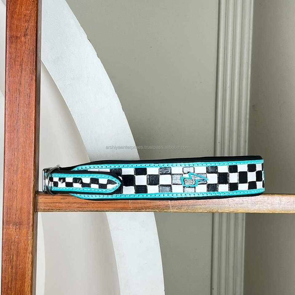Hand Tooled Genuine Leather Checkered Design Dog Collar