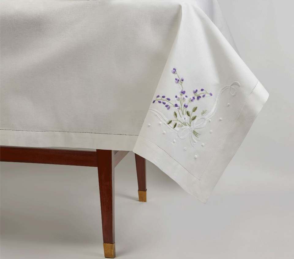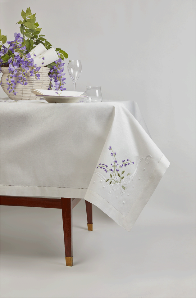 Wholesale Customized White Cotton Hemstitch Tablecloth Embroidered Pretty Purple Flower Washable for Home Restaurant Holiday Use