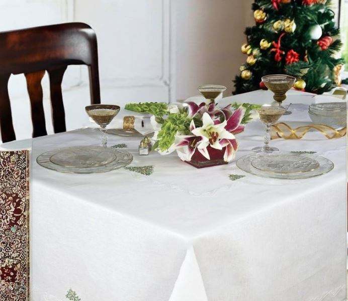 Wholesale Customized White Linen Tablecloth Christmas Tree Embroidered Full Size Table Cover Home Restaurant Holiday Washable